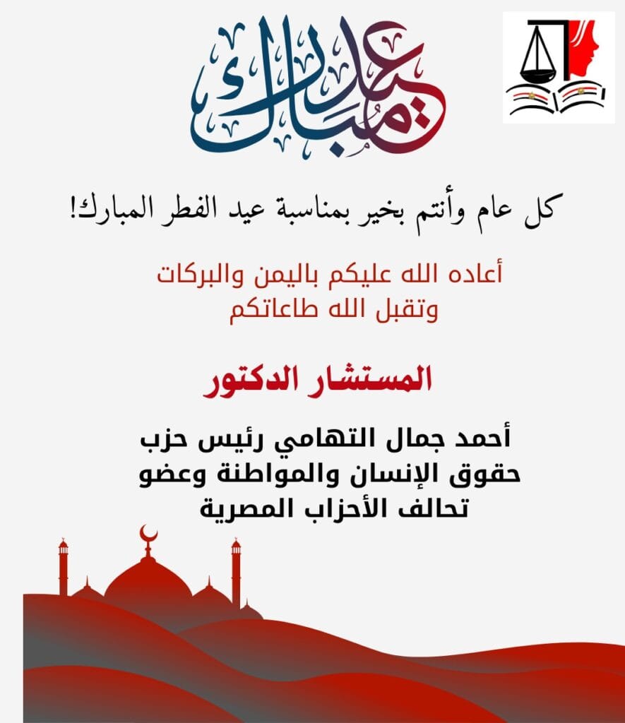 يتقدم حزب حقوق الإنسان والمواطنة وعضو تحالف الأحزاب المصرية بخالص التهاني وأطيب التبريكات إلى الشعب المصري العظيم، وإلى الأمة العربية والإسلامية، بمناسبة حلول عيد الفطر المبارك، داعين الله أن يعيد هذه المناسبة السعيدة على الجميع باليمن والخير والبركات.