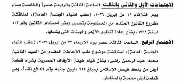 يشهد مساء الثلاثاء المقبل، مناقشة لصفقة بيع أرض بنك فيصل لهيئة الأوقاف في سياق من المخاطر لمبلغ وصل 924 مليون جنيه، باستدعاء وزراء للمناقشة حول الموضوع.